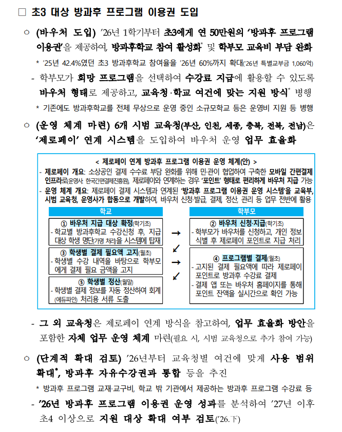 2026년부터 전국 초등학교 3학년 학생 전원에게 연 50만 원 상당의 방과후 바우처(이용권)가 지급됩니다.